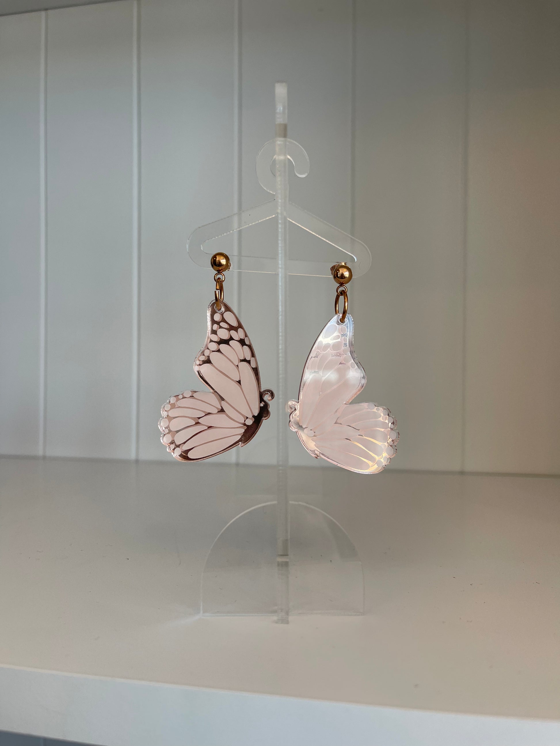 Rose Gold Plated Surgical Stainless Steel (304)Stud Drop Earrings with Acrylic Peek-a-boo butterfly in rose gold