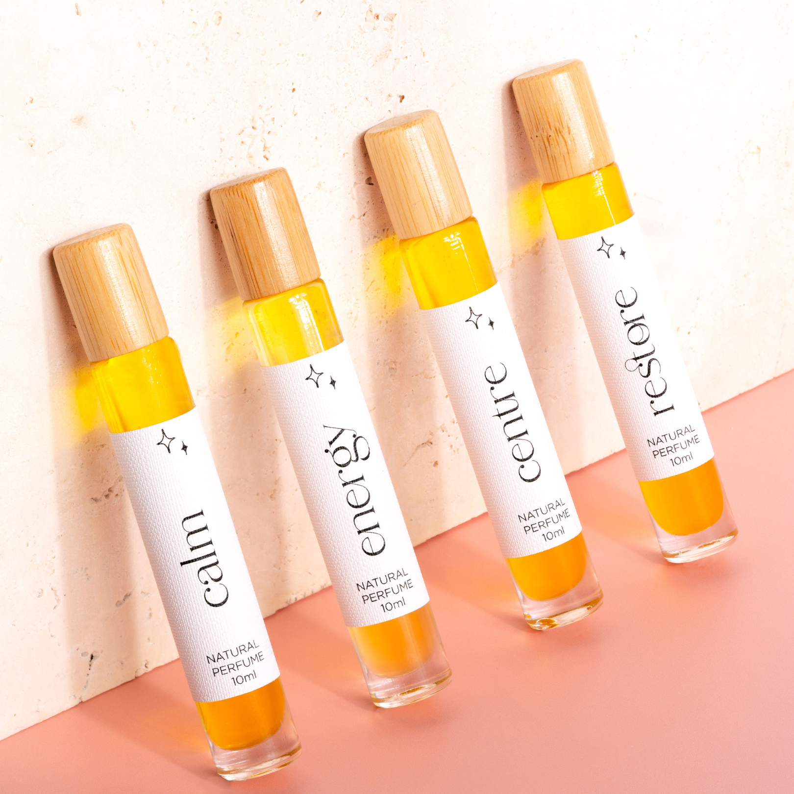 Each oil comes in an long elegant glass bottle with a rose bamboo lid and stainless steel roller.