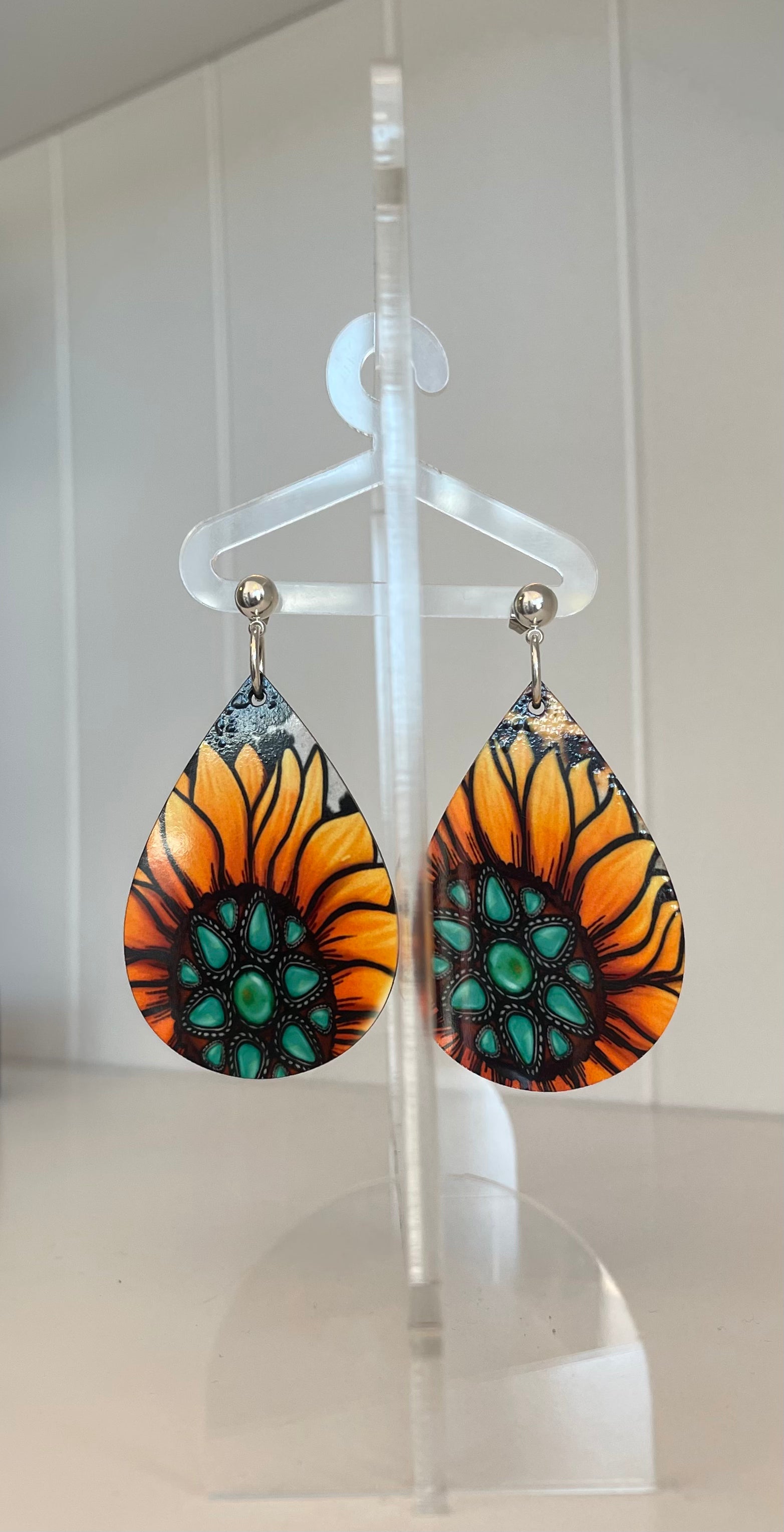 Sunflower Teal Jewel Sublimated Teardrop Earrings in Silver plated Surgical Stainless Steel Stud Drops